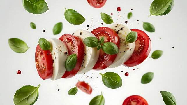 Delicious caprese salad with fresh basil leaves and sliced tomatoes and mozzarella cheese in mid air