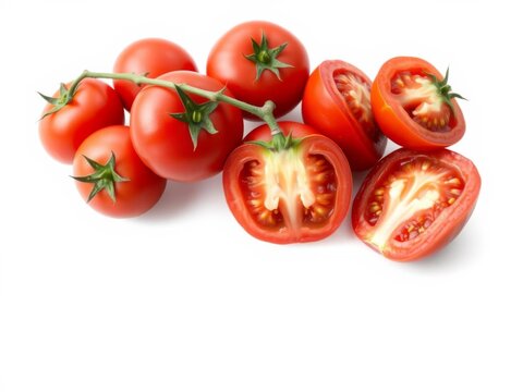 Fresh red tomatoes in various angles and views, sliced, halved, and bunch, isolated on a white background for graphic design mockups, mockup, bunch