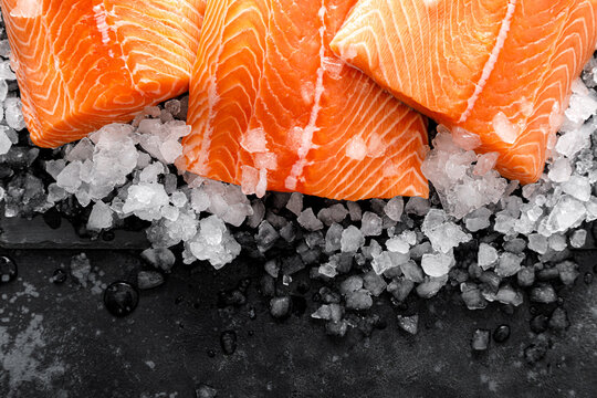 Salmon fillet. Slices of fresh raw salmon fish on ice