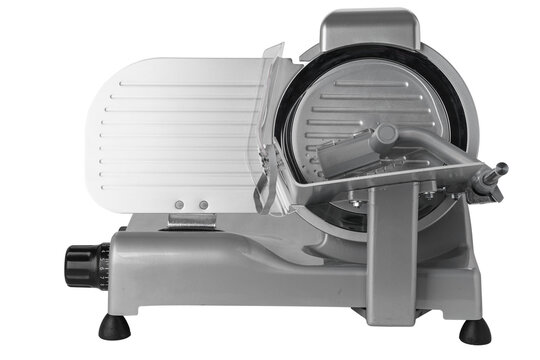 Butcher cut prosciutto, slicing prosciutto on cutting machine. View from above on female butcher cutting meat at butcher counter