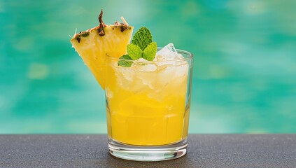 A vibrant tropical drink with a golden color in a glass, adorned with a pineapple slice and fresh mint, ideal for hydration during warm weather.