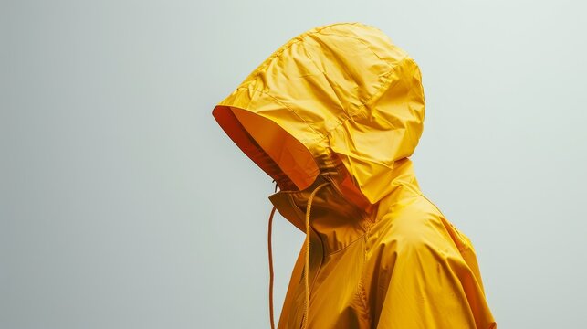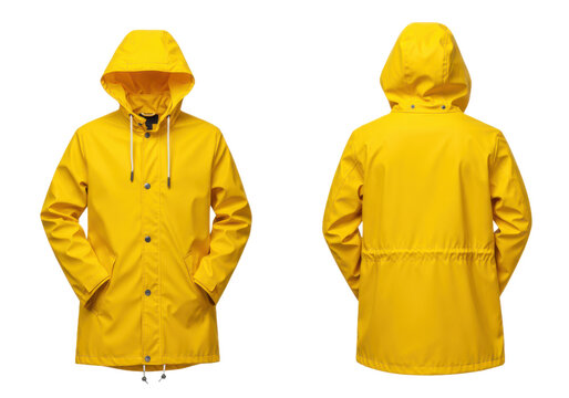 A bright yellow raincoat with a hood and zipper closure isolated on a plain  shot in studio on transparent background png