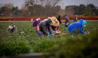 Middle aged woman in yellow raincoat walking in rainy weather in the countryside