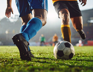 Dynamic slide tackle moment during an intense competitive soccer match with a player s legs mid slide the ball bouncing forward