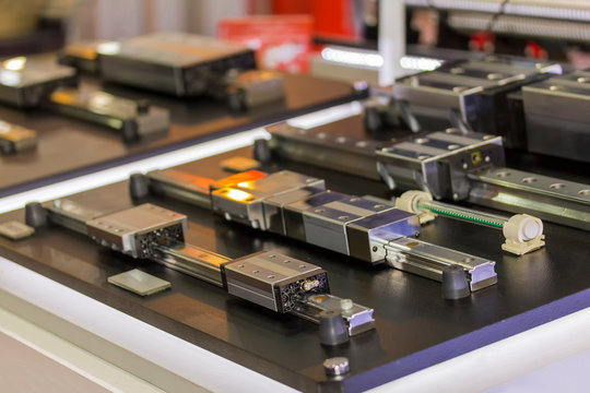 Close up many size of high quality and precision linear ball bearing guide of machine for industrial work on table