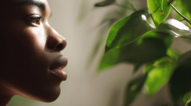 Close-up side view of a person with dark skin, long eyelashes, straight nose, and slightly parted lips, illuminated by soft warm light highlighting smooth skin texture,