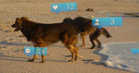 Brown dogs playing on sandy shore with social media like, comment and follow notifications
