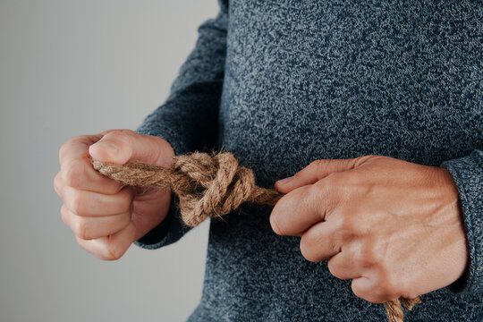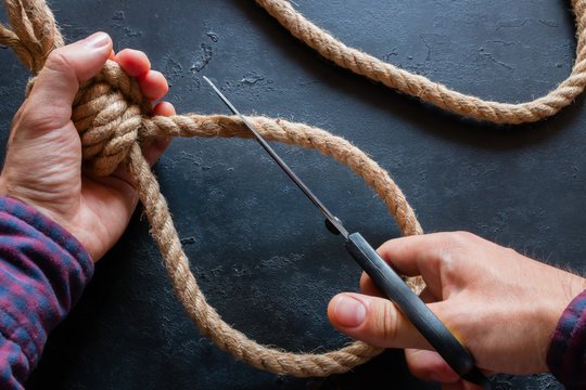 Rope is tied to a noose hanging from a black background. The rope is brown and the noose is white