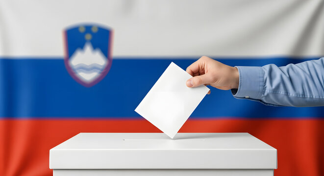A voter's hand places a white paper ballot into a ballot box during an election, with the national flag of Slovenia in the background.