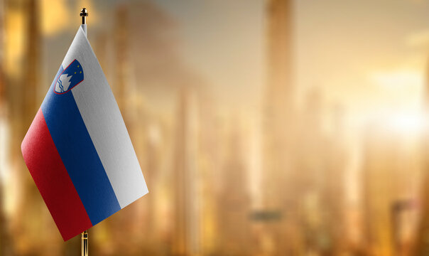 Small flags of the Slovenia on an abstract blurry background