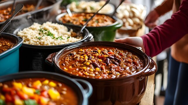 Friends having a potluck with crockpots of soup and chili