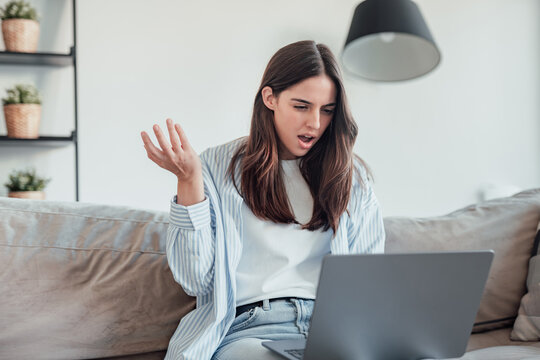 Angry young woman sit on sofa in living room frustrated having operational problems working on laptop, mad millennial girl feel stressed confused with slow internet connection or computer spam