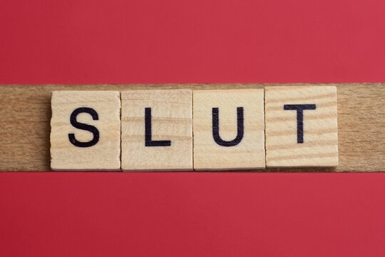 text the word slut from gray wooden small letters with black font on an red table