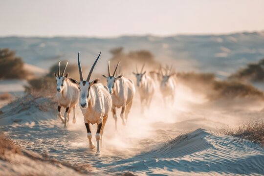 a small herd of addax moving in line across sand dunes