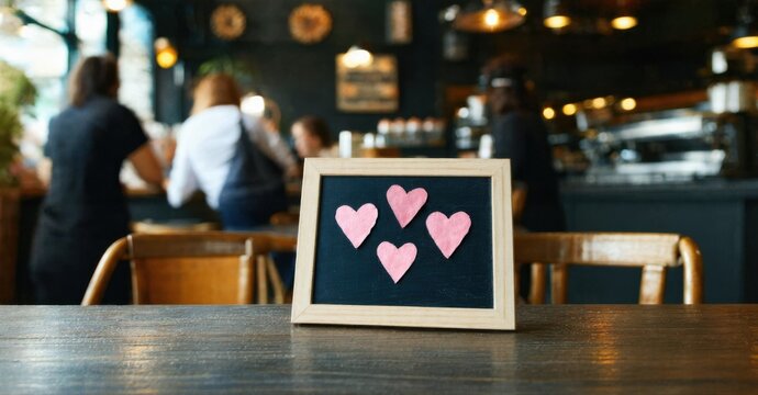 Cafe interior shows small chalkboard with pink hearts. Blurred people sit at counter, warm lighting creates cozy atmosphere.