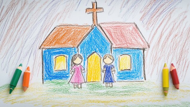 Child's crayon drawing of church and children.