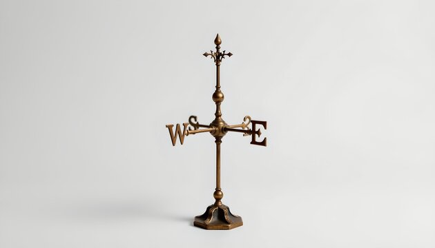 An old fashioned brass weather vane positioned against a neutral background. The weather vane is intricately designed with multiple points and compass directions marked by letters