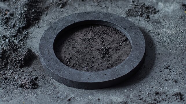 A black circular object with a hole in the middle, surrounded by dirt and rocks.