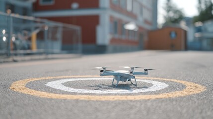 Small white drone with four propellers flying in the center of a circular road. the road appears to be empty, with no other vehicles or buildings visible in the background.