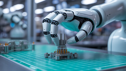 an advanced robotic arm delicately handling small electronic components in a cleanroom environment.