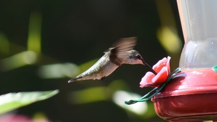 A small hummingbird hovers in mid-air, feeding nectar from a red and clear feeder with a flower-shaped port.