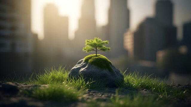 Miniature ecosystem showing a mossy sphere with an illuminated core and a small tree growing, representing life and sustainability
