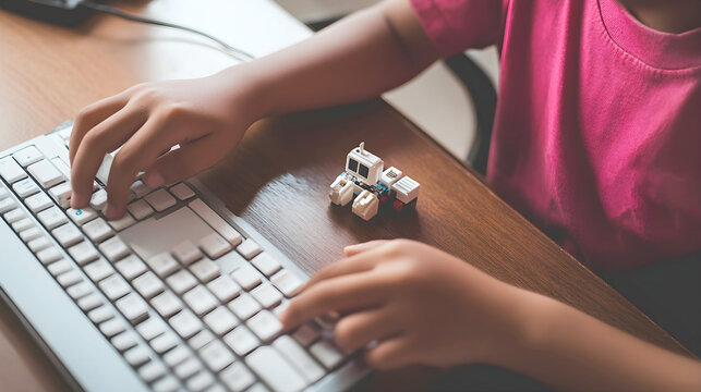 Child typing on a keyboard next to a small toy robot on a wooden desk