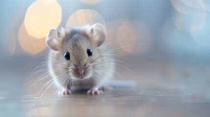A close-up of a small mouse with soft fur and large eyes, set against a blurred background of soft lights.