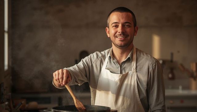 Butcher handling meat in rustic kitchen workshop