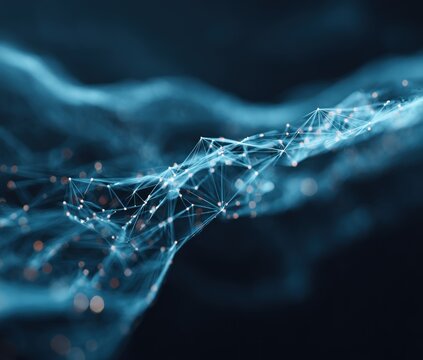 Abstract flowing mesh of blue lines and nodes with soft, out-of-focus background and small bright spots