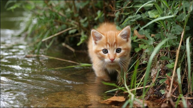 A small orange kitten with bright eyes walks cautiously along the edge of a clear stream, surrounded by vibrant grass and plants, enjoying a sunny afternoon outdoors.