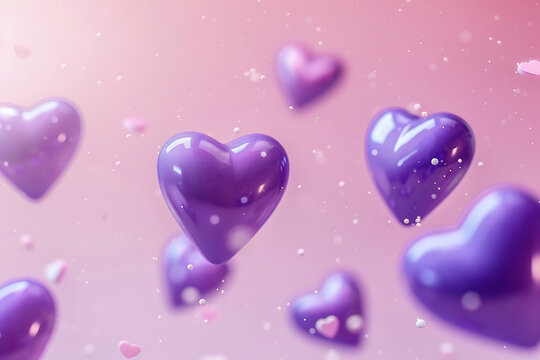 Numerous glossy purple heart shapes floating against a soft pink background with small white and pink particles