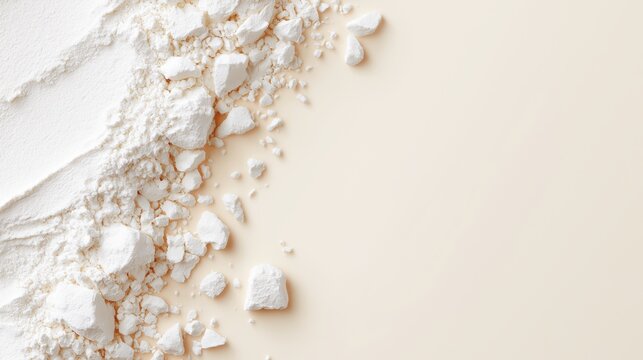 White powder scattered on beige surface with small chunks and fine particles arranged in a diagonal pattern across the image area