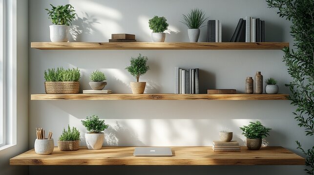 Modern minimalist office space, white walls, bright lighting, light brown and beige bookshelves, small plants, books, and elegant decorations. Clean and professional design