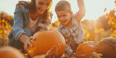 Family with small kids having much fun in pumpkin patch. Happy family at farm picking pumpkins for Halloween or Thanksgiving Day.