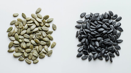 pumpkin seeds or sunflower seeds: a close-up, top-down view of pumpkin seeds and sunflower seeds, placed side by side with a small gap on a white background