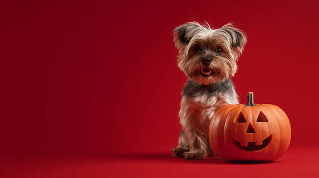 A Halloween pumpkin Jack-O’-Lantern placed in front of  dog, both isolated on a red background.