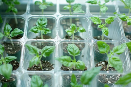 Tomato seedlings growing in plastic containers indoors