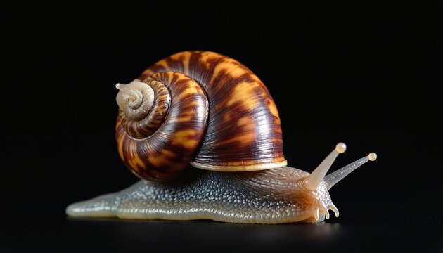 Detailed close up of snail showcasing its spiral shell and soft body. texture of shell is intricate, with shades of brown