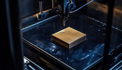 A small square wooden panel is being printed on using advanced machinery in a workshop during the evening. The intricate details can be observed as the process unfolds