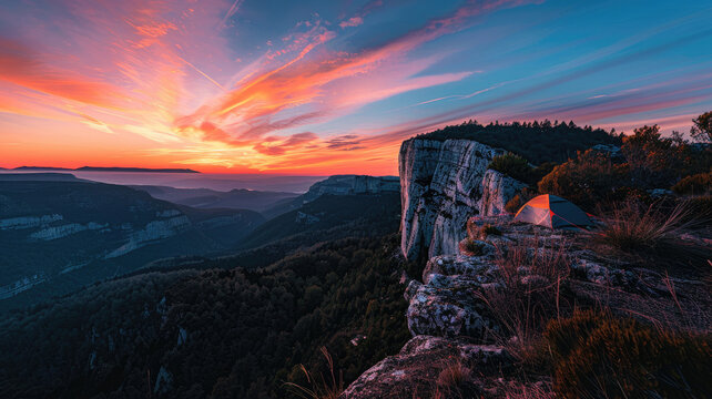 A vibrant sunrise over the mountains with a small tent perched on the edge of a cliff