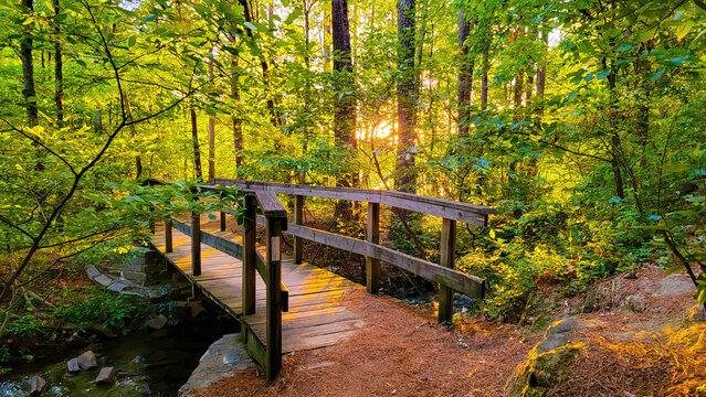 Low sun shining through forest of trees with a wooden bridge over a small stream