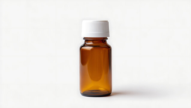 A small brown glass vial with a white label and a grey metal cap, next to a long shiny plastic syringe on a light gray background.