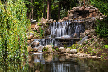 Beautiful japanese garden with small waterfall