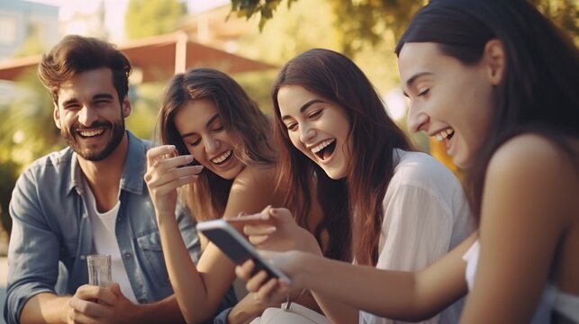 College Students Embracing Smartphone Culture Outdoors - Social Media Addiction Among Teens - Modern Tech Integration on University Campus - Young Adults Engaged with Mobile Devices.