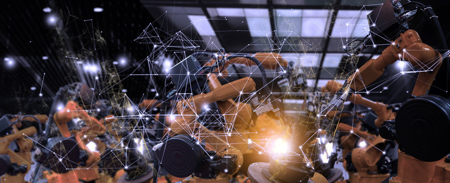Future factory concept with automation robot arms machine in intelligent factory industrial on real time monitoring system software.Digital future manufacture.