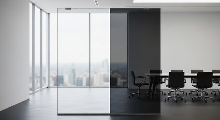 Modern Office Interior with Smart Glass Partition and Cityscape View