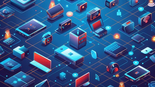 Illustration of interconnected electronic devices (routers, laptops, smart home gadgets) with data flowing through abstract lines. Generative AI