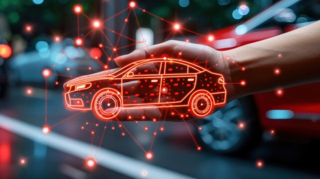Internet of Things (IoT): A hand links smart device icons (fridges, cars, lights) through signal lines, representing the seamless integration of interconnected technology.