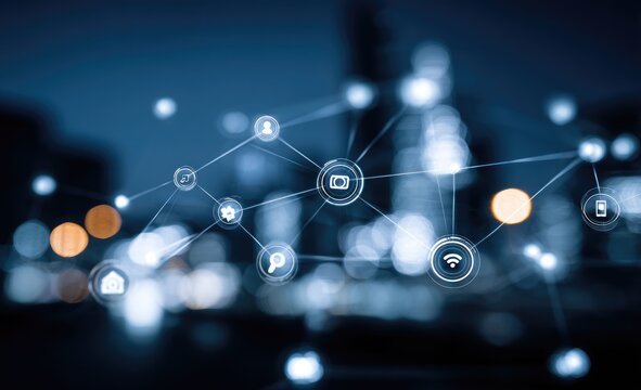 Smart home network devices interconnected, glowing, futuristic background. Use technology illustration